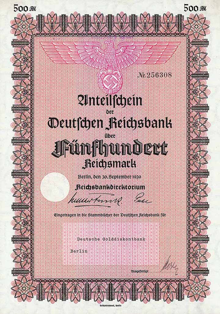 | Previous lot | Back | Next lot | | Lot: | 1134 (Deutschland 1924-1945 (III. Reich)) | | Title: | Deutsche Reichsbank | | Details: | Anteilschein 500 RM 30.9.1939. | Starting price: | 40,00 EUR | Issuing- date: | 30.09.1939 | Issuing- place: | Berlin | | Picture: |  | | Number: | 256351 | | Info: | Die Deutsche Reichsbank, geschaffen durch das Bankgesetz vom 14.3.1875, ging aus der Preußischen Bank hervor, die ursprünglich unter dem Namen Königliche Giro- und Lehnbank in Berlin im Jahre 1765 von Friedrich dem Großen gegründet worden war. Zunächst war die Reichsbank keine Staatsanstalt und ausschließlich im Besitz von Privatkapital. Dennoch war sie keine gewöhnliche Aktiengesellschaft: nicht im Handelsregister eingetragen, sondern durch Gesetz gegründet, die Befugnisse der Generalversammlung waren eingeschränkt. Die Anteilseigner wählten einen Zentralausschuss, der wiederum drei Deputierte bestimmte, die eine fortlaufende Kontrolle über die Verwaltung der Bank zu führen hatten. Leitung und Aufsicht der Bank übte das Reich aus. Diese Funktion beschränkte das Gesetz über die Autonomie der Reichsbank vom 26.5.1922 auf das reine Aufsichtsrecht. Die Leitung stand von da an ausschließlich dem Reichsbankdirektorium zu, dessen Präsident auf Vorschlag des Reichsrats vom Reichspräsidenten auf Lebenszeit ernannt wurde. Diese Autonomie hörte de facto schon vorher, de jure am 30.1.1937 auf, als sich Hitler das Reichsbankdirektorium direkt unterstellte. Bis zuletzt hatte die Bank aber private Anteilseigner, nach 1945 wurden die Reichsbank-Anteilscheine in Bundesbank-Genussscheine umgetauscht. | | Specials: | Dekorativer Druck der Reichsdruckerei, zeitgenössische Darstellung des Reichsadlers mit Hakenkreuz im Eichenlaubkranz. | | Condition: | EF+. | | Sold: | 44,00 EUR |
