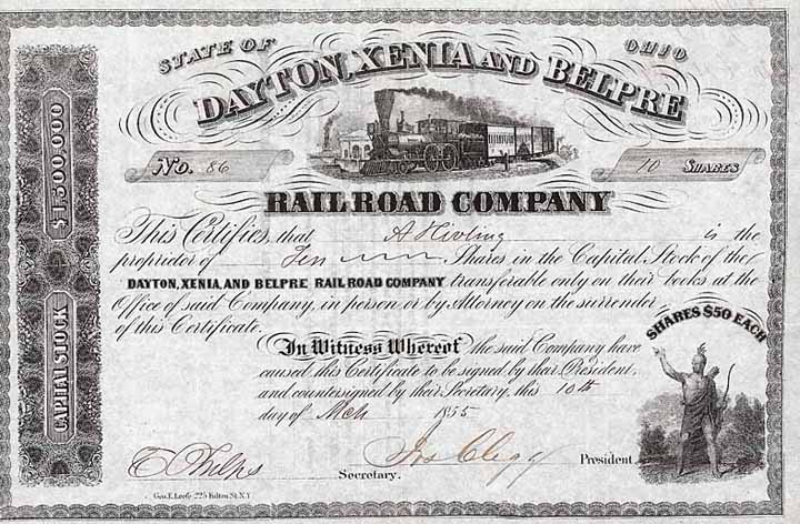 | Previous lot | Back | Next lot | | Lot: | 78 (U.S.A.) | | Title: | Dayton, Xenia & Belpre Railroad | | Details: | 22 shares à 50 $ 27.11.1854. | Starting price: | 90,00 EUR | Issuing- date: | 18.11.1856 | Issuing- place: | Ohio | | Picture: |  | | Number: | 59 | | Info: | Gründung 1851. Kleinbahn von Xenia nach Dayton, Ohio (16 Meilen). 1865 zwangsversteigert, 1868 an die Little Miami RR verkauft. | | Specials: | Zwei Vignetten mit Personenzug und Indianer. | | Condition: | EF-VF. | | Sold: | 110,00 EUR |