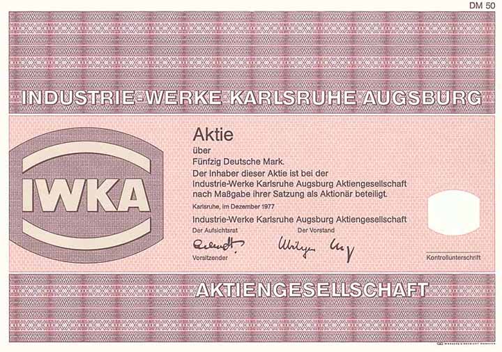 | Previous lot | Back | Next lot | | Lot: | 1618 (Deutschland 1948-2000 (Die Deutsche Mark)) | | Title: | Industrie-Werke Karlsruhe Augsburg AG | | Details: | Aktie 50 DM Dez. 1977 (Blankette). | Starting price: | 90,00 EUR | Issuing- date: | 01.12.1977 | Issuing- place: | Karlsruhe | | Picture: |  | | Info: | Gründung 1872 als Patronenhülsenfabrik Henri Ehrmann & Cie. oHG. 1889 Umfirmierung in Deutsche Metallpatronenfabrik AG. 1896 Umbenennung in Deutsche Waffen- und Munitionsfabriken AG, 1922 in Berlin-Karlsruher Industrie-Werke AG, 1936 in Deutsche Waffen- und Munitionsfabriken AG, 1949-54 in Industrie-Werke Karlsruhe AG und Sitzverlegung von Berlin nach Karlsruhe. 1970 nach Verschmelzung mit der Firma Keller & Knappich GmbH umbenannt in Industrie-Werke Karlsruhe Augsburg AG. Gehörte zu den führenden Herstellern von hochwertigen Präzisionsmaschinen, Anlagen und Apparaten sowie Metallwaren. | | Availability: | Prägesiegel lochentwertet. DM-Aktien des bedeutenden Unternehmens waren bislang nicht verfügbar. Höchstwahrscheinlich ein Einzelstück. | | Condition: | UNC-. | | Sold: | 90,00 EUR v |