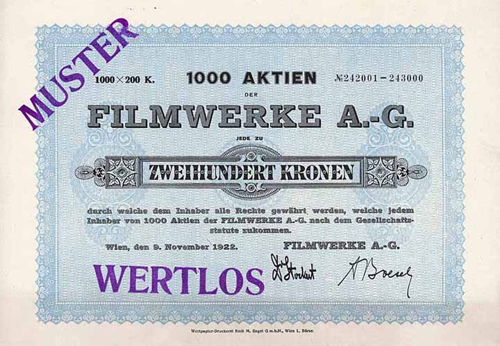 | Previous lot | Back | Next lot | | Lot: | 439 (k.u.k Monarchie / Nachfolgestaaten) | | Title: | Filmwerke AG | | Details: | Aktie 1.000 x 200 Kr. 9.11.1922. Gründeraktie. | Starting price: | 60,00 EUR | Issuing- date: | 09.11.1922 | Issuing- place: | Wien | | Picture: |  | | Number: | 242001-3000 | | Info: | Eine Scheinblüte der Inflationszeit, die bereits 1925 wieder in Konkurs ging. | | Availability: | Äußerst selten. | | Condition: | Doppelblatt, mit Kupons. Entwertet. EF. | | Sold: | unsold |