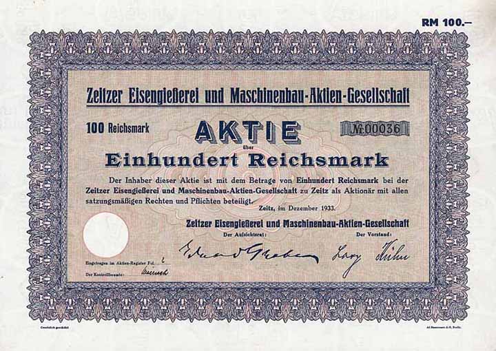 | Previous lot | Back | Next lot | | Lot: | 1550 (Deutschland 1924-1945 (III. Reich)) | | Title: | Zeitzer Eisengießerei und Maschinenbau-AG | | Details: | Aktie 100 RM Dez. 1933 (Auflage 2200). | Starting price: | 50,00 EUR | Issuing- date: | 01.12.1933 | Issuing- place: | Zeitz | | Picture: |  | | Number: | 9145 | | Info: | Gründung 1857 durch Schaede & Comp., AG seit 1871. Erzeugnisse: Maschinen für die Braunkohlenindustrie, Brecher, Hammermühlen, Förderanlagen, Walzwerke. In der DDR ab 1953 VEB Eisengießerei und Maschinenfabrik Zemag Zeitz, später ein Betrieb des VEB Schwermaschinenbaukombinat TAKRAF. Nach der Privatisierung ab Juni 1990 Zemag-GmbH. | | Availability: | Sehr selten. | | Condition: | Mit Kupons. EF. | | Sold: | unsold |