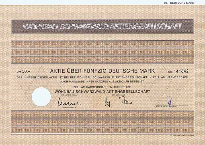 | Previous lot | Back | Next lot | | Lot: | 1856 (Deutschland 1948-2000 (Die Deutsche Mark)) | | Title: | Wohnbau Schwarzwald AG | | Details: | Aktie 50 DM Aug. 1995. Gültige Aktie. | Starting price: | 50,00 EUR | Issuing- date: | 01.08.1995 | Issuing- place: | Zell am Harmersbach | | Picture: |  | | Number: | 130717 | | Info: | Gründung 1979 als freies Wohnungsunternehmen. Niederlassungen in Freiburg und Gotha. Heute besitzt die AG mehr als 1300 Wohnungen und 100 Gewerbeeinheiten in 65 Objekten. Börsennotiz Freiverkehr Stuttgart und Düsseldorf. | | Condition: | UNC. | | Sold: | unsold |
