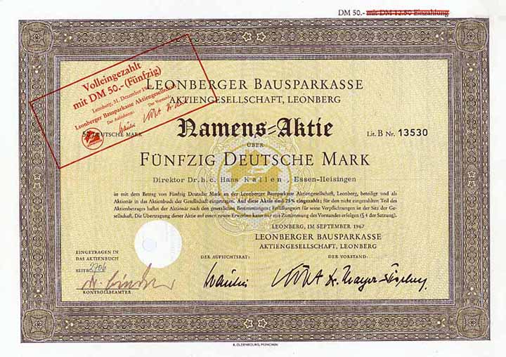 | Previous lot | Back | Next lot | | Lot: | 1775 (Deutschland 1948-2000 (Die Deutsche Mark)) | | Title: | Leonberger Bausparkasse AG | | Details: | Namens-Aktie Lit. B 50 DM Sept. 1967 (Auflage 2000). | Starting price: | 40,00 EUR | Issuing- date: | 01.09.1967 | Issuing- place: | Leonberg | | Picture: |  | | Number: | 13669 | | Info: | Gründung 1915 in Freiburg i.Br. als “Deutsche Handelsbank AG”. Der Firmensitz wurde 1926 nach Frankfurt (Main) und 1929 nach Stuttgart verlegt. 1932 umbenannt in “Kosmos Bausparkasse AG”. Übernommen wurden 1933 die Bestände der Kurmark AG Berlin und 1939 der Bausparkassen “Das Heim” eGmbH (Krefeld), Germania AG (Köln) und “Vaterhaus” GmbH (Pforzheim). Ebenfalls 1939 erwarb die Leonberger Bausparkasse eGmbH die Aktienmehrheit, brachte ihren eigenen Bestand ein und benannte die Kosmos-Bausparkasse in “Leonberger Bausparkasse AG” um. In der Nachkriegszeit die letzte noch richtig börsennotierte Bausparkasse, schließlich 2001 mit Wüstenrot verschmolzen. | | Specials: | Von diesem Nennwert die erste Emission. | | Condition: | Entwertet. UNC. | | Sold: | 44,00 EUR |