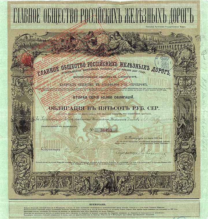 | Previous lot | Back | Next lot | | Lot: | 775 (Rußland) | | Title: | Grosse Russische Eisenbahn-Gesellschaft | | Details: | 4,5 % Obl. 500 Rbl. Silber = 2.000 F = 80 £ = 536 Thaler = 944 fl. 1.4.1859. (wie D/H SU E 1017, aber handschriftlich eingetragen auf die Staatliche Schuldentilgungs-Kommission). | Starting price: | 150,00 EUR | Issuing- date: | 01.04.1859 | Issuing- place: | St.-Petersburg | | Picture: |  | | Number: | 34493 | | Info: | Sehr bedeutende Eisenbahn, gegründet 1857 durch die Pariser Bank Crédit Mobilier. Das mit einer staatlichen 5%igen Zinsgarantie versehene Aktienkapital betrug bei der Gründung 75 Mio. Rbl. Die Bahn war konzessioniert für die Strecken Petersburg-Warschau, Moskau-Nishni-Nowgorod, Moskau-Feodosia und Orel-Libau (zusammen mehr als 4.300 km). Streckeneröffnungen: Petersburg-Gatschina, 42 Werst, 1.11.1853; Gatschina-Luga, 86 Werst, 5.12.1857; Luga-Pskoff, 129 Werst, 10.2.1859; Pskoff-Dünaburg, 241 Werst, 8.11.1860; Dünaburg-Landwarowo, 181 Werst, 9.5.1862; Landwarowo-Warschau, 371 Werst, 15.12.1862. Die vollständige Eröffnung der Strecke Moskau-Nishni-Nowgorod fand am 13.8.1862 statt. In Warschau besaß die Gesellschaft außerdem zwei Pferdebahnen und übernahm 1868 auch den Betrieb der Nicolai-Bahn. | | Specials: | Rückseitig Text auch in französisch, englisch. Äußerst dekorativ gestaltetes Papier, illustriert von dem italienisch-französischen Maler Hercole Catenacci (1816-1884). Catenacci mußte 1831, des Carbonarismus verdächtigt, nach Korfu fliehen. Zuerst machte er Reisen nach Griechenland und in den Orient, dann ließ er sich in Paris nieder, wo er vor allem bemerkenswerte Holzschnitte anfertigte. | | Availability: | Äußerst seltene Variante. | | Condition: | VF. | | Sold: | 190,00 EUR |