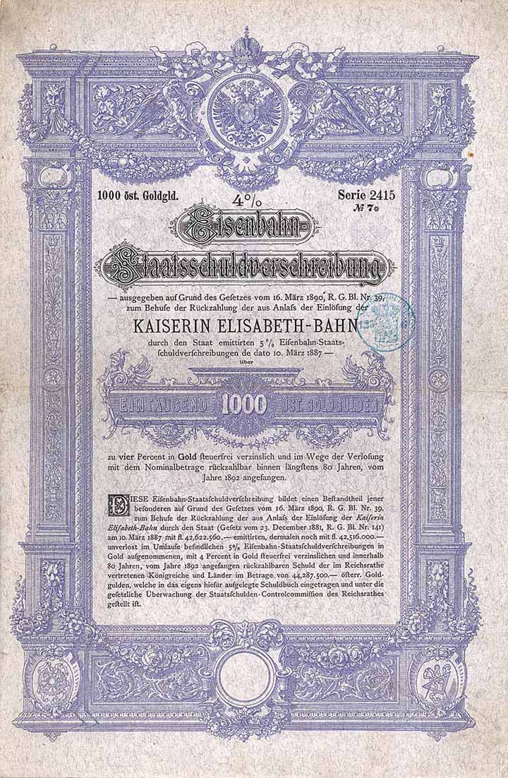 | Previous lot | Back | Next lot | | Lot: | 637 (k.u.k Monarchie / Nachfolgestaaten) | | Title: | K.k.priv. Kaiserin Elisabeth-Bahn | | Details: | 4 % Schuldv. 1000 Goldgulden 4.5.1890. | Starting price: | 60,00 EUR | Issuing- date: | 04.05.1890 | Issuing- place: | Wien | | Picture: |  | | Number: | 7 | | Info: | Die Geschichte der Elisabeth-Bahn reicht bis in das Jahr 1822 zurück, als Prof. Franz Anton Ritter von Gerstner sich den Vorarbeiten für eine über das Gebirge zu führende Eisenbahn zwischen der Donau und der Moldau widmete, nachdem er aufgefordert wurde, an die Spitze eines solchen Unternehmens zu treten. 1824 erhielt er für diese Bahn eine Konzession, die an die “K.k.priv. Österreichische Eisenbahn-Gesellschaft” überging. 1832 wurde das Privileg für erloschen erklärt und einer Gruppe um die Wiener Rothschild’s neu verliehen. 1856 erhielt der k.k. Generalkonsul in Hamburg Ernst Merck die Konzession für die Linien Wien-Linz-Salzburg und Linz-Passau. Nach über 30 Jahren unausgeführter Pläne entstand die Kaiserin-Elisabeth-Bahn nun endlich unter der Regie der gleichnamigen AG. 1881 wurde die Bahn verstaatlicht, aus den Aktien wurden Staatsschuldverschreibungen. | | Specials: | Sehr dekorativ in der Form eines floral geschmückten Portals gestaltetes Papier, oben Wappen der Habsburger. | | Availability: | Äußerst selten angeboten. | | Condition: | Doppelblatt, mit restlichen Kupons. VF+. | | Sold: | 65,00 EUR |