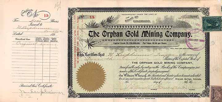 | Previous lot | Back | Next lot | | Lot: | 58 (Cripple Creek Collection) | | Title: | Orphan Gold Mining Co. | | Details: | 5.000 shares à 1 $ 29.7.1899. | Starting price: | 300,00 EUR | Issuing- date: | 29.07.1899 | Issuing- place: | Colorado Springs, Colorado | | Picture: |  | | Number: | 15 | | Info: | Gründung 1899. Eine der sieben Goldminengesellschaft im Cripple Creek Distrikt, die von Henry M. Blackmer gegründet und kontrolliert wurden, allesamt erfolgreiche Investitionen. | | Specials: | Dekorativ verziertes Papier, Goldsiegel. Original signiert von Henry M. Blackmer als Präsident. Henry Myron Blackmer, ein bedeutender Bankier, Inhaber des Bankhauses Colorado Trading & Transfer Co., machte ein Riesenvermögen mit seinen Investitionen in Cripple Creek-Goldminen (Orphan, Olive Branch, Buckhorn, Findley, Morning Star, New Haven, Pilgrim). Die Gründung einer Eisenbahnholding im Cripple Creek Distrikt ist nur dank Blackmers zustande gekommen. 1923 gründete Blackmer mit einigen Ölbaronen die Continental Trading Co. Zu seinen Partnern zählte u.a. Harry Sinclair (Sinclair Oil Co.) und Robert Stewart (Standard Oil Co. of Indiana). Blackmers hervorragende Büchersammlung wurde 1989 bei Sotheby’s versteigert. Die Henry M. Blackmer Foundation verwaltet heute knapp 3 Mio. $ und unterstützt u.a. die National Audubon Society und Mothers Against Drunk Driving. Äußerst selten. | | Availability: | Hand signed by Henry M. Blackmer as President. Extremely rare. | | Condition: | VF. | | Sold: | unsold |