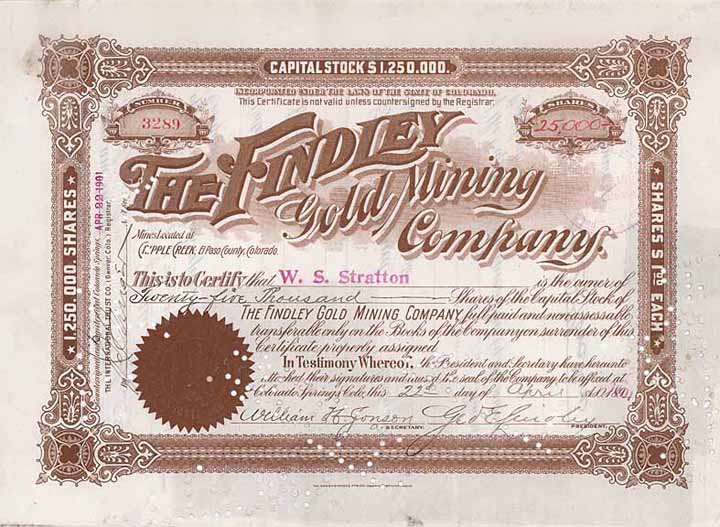 | Previous lot | Back | Next lot | | Lot: | 17 (Cripple Creek Collection) | | Title: | Findley Gold Mining Co. | | Details: | 25000 shares à 1 $ 22.4.1901 (OU W. S. Stratton). | Starting price: | 1.500,00 EUR | Issuing- date: | 22.04.1901 | Issuing- place: | Colorado Springs, Colo. | | Picture: |  | | Number: | 3289 | | Info: | Gründung am 18.12.1895 unter Beteiligung des Bankiers Henry Myron Blackmer. Die Gesellschaft betrieb die Grube Findley auf Bull Hill, 7,5 Acres groß. | | Specials: | Ausgestellt auf W. S. Stratton, rückseitig mit seiner eigenhändigen Unterschrift als Aktieninhaber anlässlich einer Übertragung. Ferner rückseitig mehrere Steuermarken. Dabei “stub”-Zertifikat Nr. 3289 aus dem Aktienbuch mit aufgeklebter Schreibmaschinenliste mit Herkunftsangaben aller 25000 shares (“Number original certificate...transfered from (Name)... number shares transferred...). Die Liste umfasst 37 einzelne Aktienbeteiligungen, die summiert 25000 shares ergeben. Unikat. | | Availability: | Issued to W. S. Stratton and signed by him on the reverse. Attached is a book stub with the informations about the 25000 shares (“Number original certificate...transfered from (Name)... number shares transferred...). Unique. | | Condition: | EF-VF. | | Sold: | unsold |