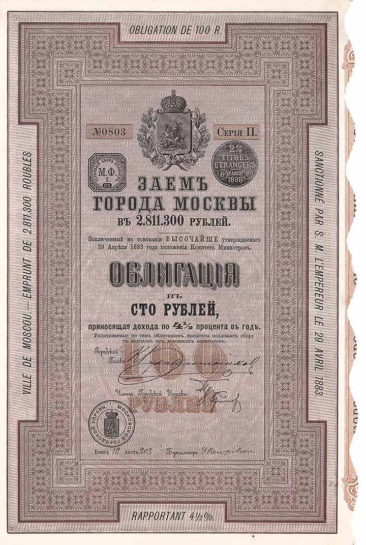 | Previous lot | Back | Next lot | | Lot: | 823 (Rußland) | | Title: | Stadt Moskau | | Details: | 4,5 % Obl. 100 Rbl. von 1896 Serie II. (Auflage 941, D/H SU T 2046a, R10). | Starting price: | 250,00 EUR | Issuing- date: | 01.01.1896 | Issuing- place: | Moskau | | Picture: |  | | Number: | 803 | | Specials: | Verwendung: Kommunale Aufgaben. | | Availability: | Extrem selten, noch nie von uns angeboten. | | Condition: | Kleine Randeinrisse hinterklebt. VF. | | Sold: | unsold |