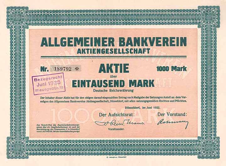 | Previous lot | Back | Next lot | | Lot: | 913 (Deutschland 1919-1923 (Die Inflation)) | | Title: | Allgemeiner Bankverein AG | | Details: | Aktie 1.000 Mark Juni 1922 (Auflage 96300). | Starting price: | 50,00 EUR | Issuing- date: | 01.06.1922 | Issuing- place: | Düsseldorf | | Picture: |  | | Number: | 189792 | | Info: | Gründung am 12.4.1921 unter Übernahme des 1889 gegründeten Löninger Bankvereins in Löningen, bis 22.8.1921: Allgemeiner Bankverein mit Sitz in Berlin, bis 19.6.1922: Allgemeiner Bankverein für Westdeutschland mit Sitz in Düsseldorf. 1927 wurde die Liquidation beschlossen. | | Condition: | Mit kpl. Kuponbogen. EF. | | Sold: | unsold |