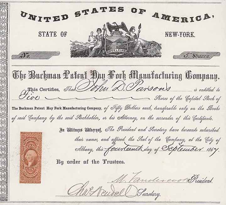 | Previous lot | Back | Next lot | | Lot: | 27 (U.S.A.) | | Title: | Buckman Patent Hay Fork Manufacturing Co. | | Details: | 5 shares à 50 $ 14.9.1867. Gründeraktie. | Starting price: | 100,00 EUR | Issuing- date: | 14.09.1867 | Issuing- place: | Albany | | Picture: |  | | Number: | 4 | | Info: | Ein alter und ungewöhnlicher Industrie-Wert: Patent-Heugabeln, das gibt’s nicht oft auf Aktien. | | Specials: | Schöner Druck mit feiner Randverzierung und allegorischer Vignette. | | Condition: | Unentwertet. EF-VF. | | Sold: | unsold |