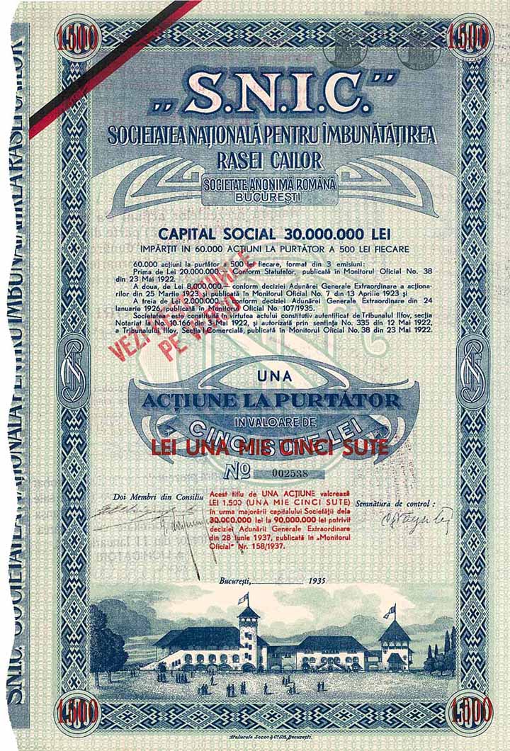 | Previous lot | Back | Next lot | | Lot: | 519 (Rumänien) | | Title: | S.N.I.C. Soc. Nationala pentru Imbunatatirea Rasei Cailor S.A. | | Details: | Aktie 1.500 Lei von 1937. | Starting price: | 100,00 EUR | Issuing- date: | 01.01.1937 | Issuing- place: | Bukarest | | Picture: |  | | Number: | 2537 | | Info: | Die “Nationale Gesellschaft zur Verbesserung der Pferderassen S.N.I.C.” wurde gegründet 1922. Sie besaß ca. 70 ha Weideland in Floreasca, wo sie auch eine Rennbahn besaß. Die Gesellschaft bezweckte die Förderung aller Unternehmungen, welche auf die Verbesserung der Pferderasse in Rumänien hinzielen. | | Specials: | Für die Aktienausgabe wurden die Vordrucke von 1935 verwendet, nachdem sie überdruckt wurden (die letzte Kapitalerhöhung wurde durchgeführt 1926). Sehr dekorative Aktiengestaltung mit großer Darstellung des Anwesens in Floreasca. Jugendstilelemente im Unterdruck. Rückseitig mehrere Liquidationsstempel bis 1947. Mit anh. restlichen Kupons ab 1939. | | Availability: | Nur zwei Stücke wurden gefunden, dieses ist das letzte, dem Markt zur Verfügung stehende Stück. | | Condition: | EF-VF. | | Sold: | unsold |