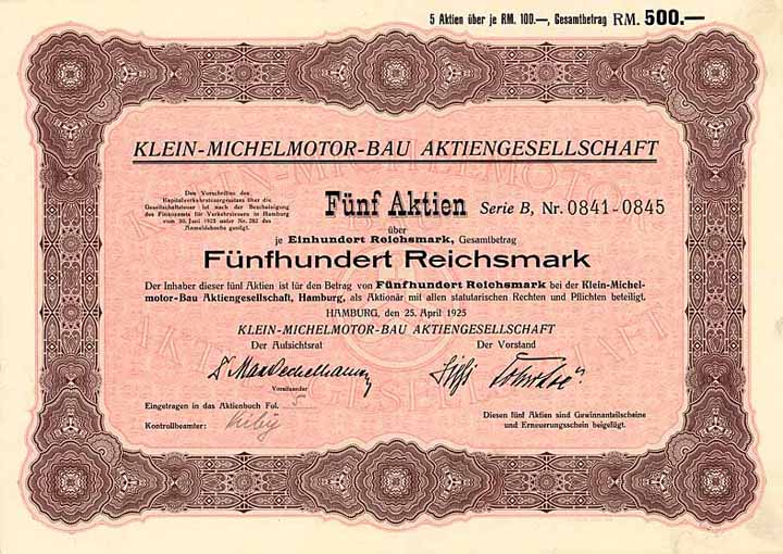 | Previous lot | Back | Next lot | | Lot: | 456 (Germany until 1945) | | Title: | Klein-Michelmotor-Bau AG | | Details: | Sammelaktie Ser. B 5 x 100 RM 25.4.1925 (R 10). | Starting price: | 200,00 EUR | Issuing- date: | 25.04.1925 | Issuing- place: | Hamburg | | Picture: |  | | Number: | 841-5 | | Info: | Gründung 1923 mit Geschäftssitz Hamburg, Gr. Reichenstr. 27 (Afrika-Haus) durch 23 Firmen und Einzelpersonen zwecks Bau und Vertrieb von Klein-Michelmotoren. Geschäftsgrundlage war der 1921 von Hermann Michel erfundene und 1921/26 in den USA patentierte Michel-Motor, ein Zweitakt-Dieselmotor, der von der Michel Engine Company in Kiel produziert wurde. Der Michel-Motor war eine ungewöhnliche Form des Gegenkolbenmotors, einzigartig insofern als seine Zylinder keine offenen Zylinder mit zwei Kolben waren, sondern eine Y-Form hatten und drei Kolben darin arbeiteten (im entfernten Sinne der Urgedanke des Wankelmotors). Michelmotoren fanden auch im Flugbetrieb Verwendung, und in den 1930er Jahren erscheint ein für U-Boote bestimmter Michel-Schiffsmotor mit 1.000 PS und 42 t Gewicht (ein vergleichbarer Viertakt-Dieselmotor wog mit 128 t drei Mal so viel). Die Weiterentwicklungen des Michelmotors wurden immer kleiner und leichter und standen vor einer großen Karriere im LKW-Bereich, ehe der 2. Weltkrieg die Erfolgsgeschichte beendete. 1947 wurde die AG im Handelsregister gelöscht. | | Specials: | Dekorativ, Querschnitt eines Michelmotors im Unterdruck. | | Availability: | Bereits 1987 in die Sammlung gekommen, diese bislang vollkommen unbekannte Ausgabe lag auch nicht im Reichsbankschatz! | | Condition: | EF | | Sold: | unsold |