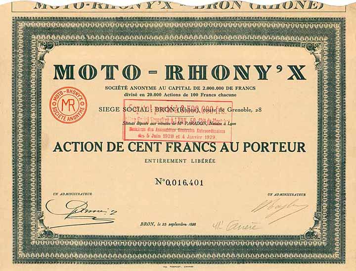 | Previous lot | Back | Next lot | | Lot: | 104 (Frankreich) | | Title: | Moto-Rhony‘X S.A. | | Details: | Action 100 F 25.9.1928. Gründeraktie (Auflage 20000). | Starting price: | 60,00 EUR | Issuing- date: | 25.09.1928 | Issuing- place: | Bron (Rhone) | | Picture: |  | | Number: | 16401 | | Info: | Die Produktion von Rhony‘X-Motorrädern startete 1924 in Bron an der Rhone, später wurde das Werk in‘s nahe Lyon verlegt. Es gab 4 Typen, Typ 1 war eine Monovitesse, Typ B war mit einem Zweigang-Antrieb ausgestattet, Typ C hatte Doppelketten und Typ D war mit einem stärkeren 250-ccm-Motor ausgestattet. Neben Motor-Eigenentwicklungen wurden auch Einbaumotoren von JAP und Chaise verwendet. Nach der Weltwirtschaftskrise wurde die Produktion eingestellt. | | Availability: | Unentwertet, kpl. Kuponbogen anhängend. | | Condition: | EF- | | Sold: | unsold |