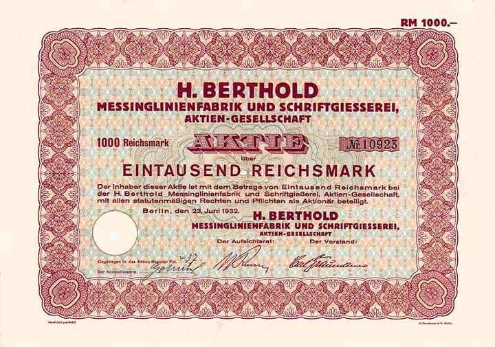 | Previous lot | Back | Next lot | | Lot: | 1491 (Deutschland 1924-1945 (III. Reich)) | | Title: | H. Berthold Messinglinienfabrik und Schriftgiesserei AG | | Details: | Aktie 1.000 RM 23.6.1932 (Auflage 333, R 5). | Starting price: | 45,00 EUR | Issuing- date: | 23.06.1932 | Issuing- place: | Berlin | | Picture: |  | | Number: | 10870 | | Info: | Gründung 1858, AG seit 1896. Erzeugnisse: Schriften und Messinglinien für Buchdruckzwecke, Bedarfsartikel für das graphische Gewerbe. Berthold expandierte rasch: Übernommen wurde 1897 die Schriftgießerei Bauer & Co. in Stuttgart und Düsseldorf, 1899 Errichtung einer Fabrik in St. Petersburg, ferner übernommen 1905 J. H. Rust & Co. in Wien, 1917 Emil Gursch in Berlin, 1918 die Schriftgießereien Gottgried Böttger, F. A. Brockhaus, C. F. Rühl in Leipzig und A. Kahle Söhne in Weimar, 1920 Julius Klinkhardt in Leipzig, 1922 C. Kloberg in Leipzig und 1928 die Schriftgießerei der A.-G. für Schriftgießerei und Maschinenbau in Offenbach/Main. In Riga bestand bei der H. Berthold Schriftgießerei H. Leunig & Co. eine 100 %ige Beteiligung, außerdem mit je 50 % bei der Erste ungarische Schriftgießerei AG in Budapest und der Haas’sche Schriftgießerei AG in Münchenstein bei Basel beteiligt. Mit dem Niedergang des Buchdrucks mußte das Produktionsprogramm ab Ende der 60er Jahre völlig umgestellt werden: Berthold wurde zum größten Hersteller von Fotosetzmaschinen in Europa. 1971 umfirmiert in H. Berthold AG, 1979 Umzug in die vormalige Fabrik der Loewe Opta GmbH in Berlin-Steglitz. Die immensen Entwicklungskosten der völlig neuen Fotosatz-Technologie (bei der auch schon Lasertechnik zum Eisantz kam) wurden aber nie wieder eingespielt: 1993 ging die Traditionsfirma in Konkurs. | | Specials: | Lochentwertet (RB). | | Availability: | R 5 | | Condition: | EF. | | Sold: | 50,00 EUR |