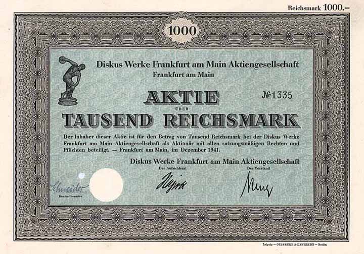 | Previous lot | Back | Next lot | | Lot: | 1421 (Deutschland 1924-1945 (III. Reich)) | | Title: | Diskus Werke Frankfurt am Main AG | | Details: | Aktie 1.000 RM Dez. 1941 (R 6). | Starting price: | 120,00 EUR | Issuing- date: | 01.12.1941 | Issuing- place: | Frankfurt a.M. | | Picture: |  | | Number: | 1335 | | Info: | Gründung als GmbH 1911, AG seit 1922. Herstellung von Flachschleifmaschinen und Schleifwerkzeugen. 1992 Übertragung des Vermögens und des operativen Geschäfts auf die Diskus Werke Schleiftechnik GmbH. Heute reine Management-Holding. | | Specials: | Lochentwertet (RB). | | Availability: | Nur 64 Stück lagen im Reichsbankschatz. (R 6) | | Condition: | EF. | | Sold: | unsold |