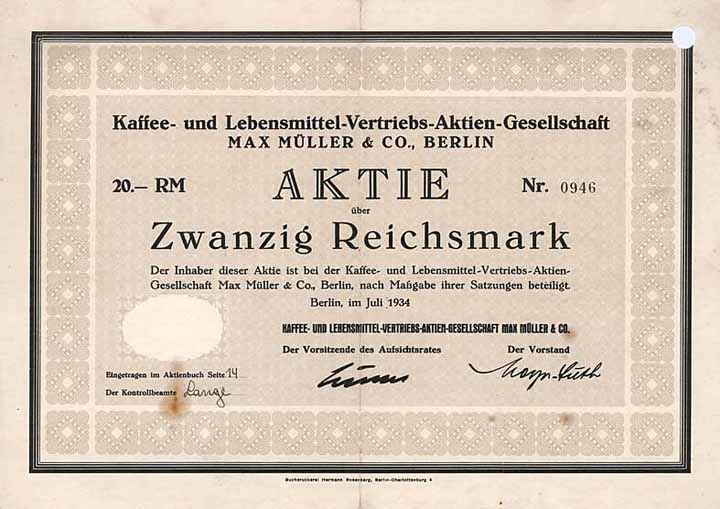 | Previous lot | Back | Next lot | | Lot: | 1533 (Deutschland 1924-1945 (III. Reich)) | | Title: | Kaffee- und Lebensmittel-Vertriebs-AG Max Müller & Co. | | Details: | Aktie 20 RM Juli 1934 (Auflage 1700, R 7). | Starting price: | 125,00 EUR | Issuing- date: | 01.07.1934 | Issuing- place: | Berlin | | Picture: |  | | Number: | 946 | | Info: | Gründung 1914. Vertrieb von Kaffee, Lebens- und Genussmitteln aller Art. Die Ges. besaß die beiden Grundstücke Müllerstr. 166a und 167 sowie das Grundstück Schönhauser Str. 3. 1927 erwarb die Ges. die Masse der in Konkurs geratenen, seit über 30 Jahren bestehenden Firma Rauer & Co., nebst zwei Ladengeschäften. 1936 Konkurseröffnung. | | Specials: | Lochentwertet (RB). | | Availability: | Nur 27 Stück lagen im Reichsbankschatz. (R 7) | | Condition: | VF. | | Sold: | unsold |