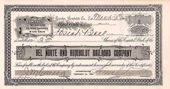 | Previous lot | Back | Next lot | | Lot: | 44 (U.S.A.) | | Title: | Del Norte & Humboldt Railroad | | Details: | 25 shares à 100 $ 5.3.1903. Gründeraktie. | Starting price: | 360,00 EUR | Issuing- date: | 05.03.1903 | Issuing- place: | Eureka, Humboldt Co., Cal. | | Picture: |  | | Number: | 2 | | Info: | Gegründet 1903 zur Verbindung der Verwaltungsbezirke Del Norte County, ganz im Nordwesten Kaliforniens, mit dem im Süden angrenzenden Humboldt County. Die Bahn wurde sowohl für Passagierverkehr als auch für Holztransporte benutzt. | | Specials: | Unentwertet. | | Availability: | Extrem selten. | | Condition: | EF. | | Sold: | 380,00 EUR |