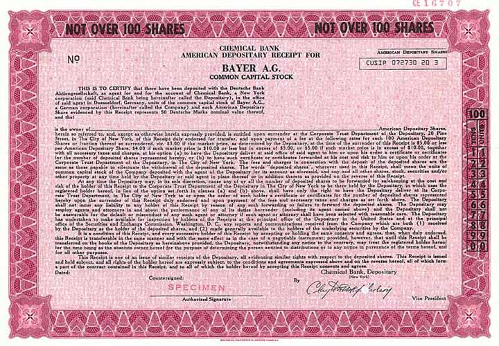 | Previous lot | Back | Next lot | | Lot: | 1584 (Deutschland 1948-2000 (Die Deutsche Mark)) | | Title: | Bayer AG | | Details: | Aktie 50 DM von 1975 (American Depository Share der Chemical Bank, Specimen, R 10). | Starting price: | 60,00 EUR | Issuing- date: | 01.01.1975 | Issuing- place: | Leverkusen | | Picture: |  | | Info: | Die Firma Friedr. Bayer et comp. wurde 1863 in Wuppertal-Barmen gegründet. 1881 Umwandlung in eine AG als “Farbenfabriken vorm. Friedr. Bayer & Co.” 1912 Verlegung des Hauptsitzes von Elberfeld nach Leverkusen. 1925 verlor Bayer mit der I.G. Farben-Fusion vorerst die Selbständigkeit. Als die I.G. Farbenindustrie AG auf alliierte Anordnung zerschlagen wurde, kam es 1951 zur Neugründung als Farbenfabriken Bayer AG. 1972 Umfirmierung in Bayer AG. Heute einer der weltgrößten Chemie- und Pharmakonzerne. | | Specials: | Im Zusammenhang mit Firmenkäufen und einer starken Ausweitung des USA-Geschäfts Anfang der 1970er Jahre wurden die Bayer-Aktien auch an der New Yorker Börse eingeführt. Wegen der inzwischen fast unerfüllbaren US-Vorschriften und jährlicher Kosten von fast 5 Mio. $ veranlasste Bayer 2007 das De-Listing in New York. | | Availability: | Nur 4 Stück wurden im ABNC-Archiv gefunden. (R 10) | | Condition: | Entwertet, sonst UNC. | | Sold: | unsold |