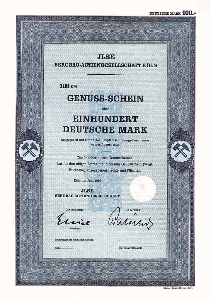 | Previous lot | Back | Next lot | | Lot: | 1800 (Deutschland 1948-2000 (Die Deutsche Mark)) | | Title: | ILSE Bergbau-AG | | Details: | Genuss-Schein 100 DM Juni 1960 (Blankette, R 10). | Starting price: | 40,00 EUR | Issuing- date: | 01.07.1960 | Issuing- place: | Köln | | Picture: |  | | Info: | 1871 siedelte sich die ursprünglich in Berlin ansässige Chemiefabrik Kunheim & Co. in Bückgen bei Großräschen in der Lausitz an, kaufte dort einige Braunkohlenfelder und errichtete eine Sauerstofffabrik. Das für die Fabrik benötigte Brennmaterial wurde in unmittelbarer Nachbarschaft auf der Grube ILSE im Tiefbau gefördert. Der im Bergwerk anfallende stark tonhaltige Abraum wurde in einer zeitgleich errichteten Ziegelei verarbeitet. 1888 Ausgliederung des Bergbaubetriebes in die ILSE Bergbau-AG. Bereits 1885 hatte man auf Grube ILSE den Tagebaubetrieb eingeführt; für die Abraumbewältigung nutzte man moderne Dampfbagger. Bis 1900 wurden zahlreiche neue Gruben aufgeschlossen und Brikettfabriken errichtet. Die Ziegelei der ILSE erlangte auch kunstgeschichtliche Bedeutung durch die anspruchsvolle Herstellung von Figuren des Bildhauers ERNST BARLACH. Architekturgeschichtlich interessant ist die als Arbeitersiedlung errichtete “Gartenstadt Marga” bei Brieske, die als früheste Umsetzung des Gartenstadtgedankens in Deutschland gilt. Schon 1924 war die ILSE das GRÖSSTE BERGBAUUNTERNEHMEN ÖSTLICH DER ELBE. Mehrheitsaktionär war jetzt der Aussiger Petschek-Konzern, eine Schachtelbeteiligung besaß die reichseigene VIAG. 1938 übernahm die VIAG im Zuge einer “Arisierung” die Anteile der jüdischen Familie Petschek (nach 1945 wurden die früheren Aktionärsverhältnisse wieder hergestellt, wobei die Petschek-Gruppe inzwischen nach New York emigriert war). In den 1940er Jahren wurden in drei Tagebaubetrieben in den Kreisen Calau, Hoyerswerda und Spremberg jährlich fast 15 Mio. t Braunkohle gefördert, die dann an 8 eigene Brikettfabriken und 6 eigene Verbundkraftwerke gingen. In der späteren DDR wurden nach 1945 etwa die Hälfte der Anlagen von den Sowjets demontiert, ansonsten gingen die Betriebe nach der 1947 erfolgten Enteignung in Volkseigentum über und kamen nach der Wende 1990 letztendlich zur Laubag (Lausitzer Braunkohle AG) bzw. der Mibrag (Mitteldeutsche Braunkohle AG). Die AG selbst verlegte ihren Sitz 1948 nach Kassel, 1949 nach Bremen und schließlich 1958 nach Köln. Von dem geringen verbliebenen Westvermögen wurde 1947 die Braunkohlengerechtsame am Meißner in Hessen erworben. Wegen Fehlens weiterer Mittel zum Aufschluß 1949 verpachtet an die Bergwerk Frielendorf AG bzw. die Braunkohlen- und Brikett-Industrie (Bubiag). 1950 Erwerb von 13 Maximalfeldern im rheinischen Braunkohlenrevier nahe Jüchen. 1956/57 wurden die Felder wieder verkauft und der Erlös in RWE-Aktien investiert. Auch die RWE-Aktien wurden ab 1964 wieder verkauft, den Erlös investierte die ILSE über die “Ilse Energie- und Industrieanlagen GmbH” in den Kraftwerksbau, bei der sich 1966 zusätzlich die Bayernwerk AG beteiligte. Zuletzt börsennotiert in Düsseldorf und Berlin. 1973 Abschluß eines Ergebnisabführungsvertrages mit der VIAG, 1994 auf die VIAG verschmolzen. | | Specials: | Zwei Vignetten mit Hammer und Schlegel in der Umrandung. | | Availability: | R 10 | | Condition: | Lochentwertet. UNC-EF. | | Sold: | unsold |