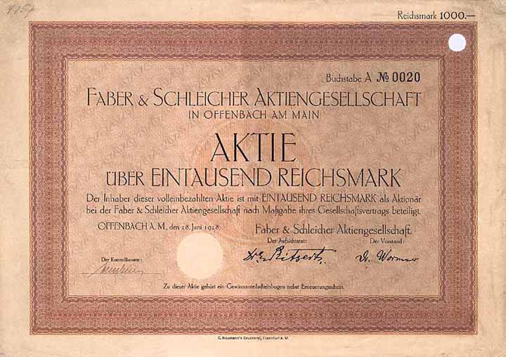 | Previous lot | Back | Next lot | | Lot: | 1293 (Germany until 1945 (Reichsbank)) | | Title: | Faber & Schleicher AG | | Details: | Aktie 1.000 RM 28.6.1928 (Auflage 800, R 12). | Starting price: | 450,00 EUR | Issuing- date: | 28.06.1928 | Issuing- place: | Offenbach | | Picture: |  | | Number: | 20 | | Info: | Gründung 1871 als “Associationsgeschäft zur Produktion von lithographischen Schnellpressen” durch Louis Faber und Adolf Schleicher. AG seit 1897 als “Faber & Schleicher Maschinenfabrik auf Actien”. Zunächst Bau von Steindruck-Schnellpressen, 1911 kommt die erste ROLAND-Offsetpresse auf den Markt. 1957 Umfirmierung in “Roland Offsetmaschinenfabrik Faber & Schleicher AG”. 1979 Vereinigung mit dem Druckmaschinenbereich der M.A.N. und Umfirmierung in "MAN Roland Druckmaschinen AG". Heute weltweit zweitgrößter Hersteller von Druckmaschinen und Weltmarktführer im Rollenoffset, beschäftigt werden 8.700 Mitarbeiter in den Werken Augsburg, Offenbach, Plauen und Mainhausen. 2005/06 squeeze-out der Kleinaktionäre der bis dahin börsennotierten AG, später verkauft MAN die Mehrheit an den Investor “Allianz Capital Partners GmbH”. | | Specials: | Lochentwertet (RB). | | Availability: | Einzelstück aus dem Reichsbankschatz, vorher nicht bekannt gewesen. (R 12) | | Condition: | Fleckig. VF. | | Sold: | unsold |