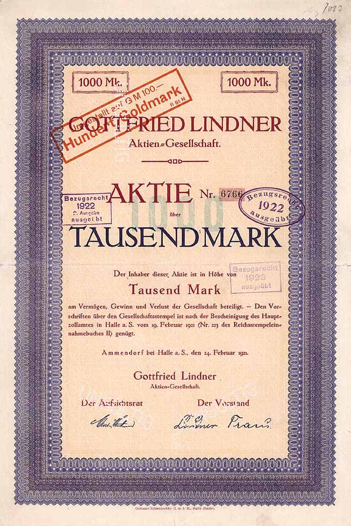 | Previous lot | Back | Next lot | | Lot: | 1322 (Germany until 1945 (Reichsbank)) | | Title: | Gottfried Lindner AG | | Details: | Aktie 1.000 Mark 24.2.1921 (Auflage 1600, R 10). | Starting price: | 400,00 EUR | Issuing- date: | 24.02.1921 | Issuing- place: | Ammendorf b. Halle a.S. | | Picture: |  | | Number: | 6766 | | Info: | Gründung 1823, AG seit 1905. Erzeugnisse: Waggons, Straßenbahnwagen, Omnibusaufbauten, Lastanhänger, Flachsraufmaschinen. Werke in Ammendorf, Berlin, Dresden, Gaggenau, Köln, Königsberg, Hamburg und Nürnberg. Der Karosseriebau wurde 1928 an die Ambi-Budd-Presswerke in Berlin verkauft. 1949 teilte sich die Geschichte: In Nürnberg wurde der zweite Hauptsitz angemeldet, die Werke Nürnberg, Gaggenau (Baden), Berlin-Tempelhof und Köln gingen wieder in Betrieb. 1952 Abschluß eines Pacht- und Lizenzvertrages mit der Waggonfabrik AG in Rastatt, dessen Kündigung 1956 wegen nicht ausreichender Rentabiliät der Anfang vom Ende war: 1965 kam im Westen der Konkurs. Das Werk Ammendorf wurde 1949 entschädigungslos von einer sowjetischen Aktiengesellschaft in Besitz genommen. Nach der Wende gehörte es zuletzt zur Daimler-Tochter Adtranz, die dann von Bombardier übernommen wurde. 2004 kam trotz erbitterter Gegenwehr von Belegschaft und Landesregierung das Aus auch für das traditionsreiche Ammendorfer Werk. | | Specials: | Lochentwertet (RB). | | Availability: | Nur 4 Stück lagen im Reichsbankschatz, vorher nicht bekannt gewesene Emission. (R 10) | | Condition: | Ungültig perforiert. VF. | | Sold: | unsold |