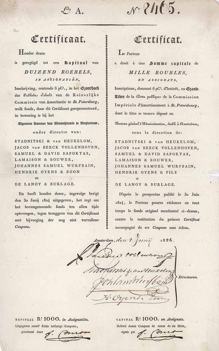 | Previous lot | Back | Next lot | | Lot: | 779 (Rußland) | | Title: | Russische Fondsen | | Details: | 6 % Certificaat 1.000 Rbl. 2.6.1826. | Starting price: | 80,00 EUR | Issuing- date: | 02.06.1826 | Issuing- place: | Amsterdam | | Picture: |  | | Number: | 8465 | | Specials: | Eines der ältesten "depository receipts" der Finanzgeschichte: Mit diesem Zertifikat verbrieften die Amsterdamer Privatbankiers Stadnitski & van Heukelom,Jacob van Beeck Vollenhoven, Samuel & David Saportas, Lamaison & Bouwer, Johannes Samuel Wurfbain, Hendrik Oyens und de Lanoy & Burlage Unterbeteiligungen an dem auf ihren Namen im Hauptbuch der Russischen Staatsschulden eingetragenen Besitz an der 6 % Russischen Anleihe, einer "Ewigen Rente" von 1824 in Assignaten. Text in niederländisch/französisch. Originalunterschriften. | | Availability: | Mit Kupons. | | Condition: | VF. | | Sold: | 85,00 EUR |